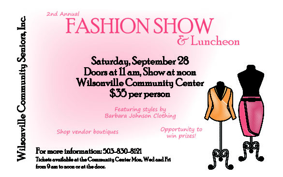 Don’t miss this one. Wilsonville Seniors sponsors this fashion show. Doors open at 11am.